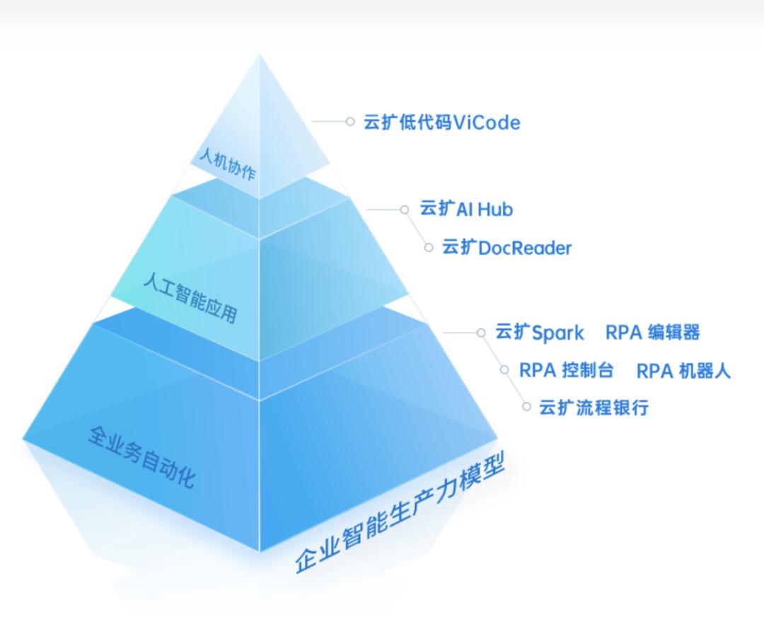 - 云扩科技,2017年成立,今年3月底完成未透露具体金额的B+轮融资(B轮为3000万美元),金沙江创投和红杉中国是其连续投资人。云扩 RPA 平台功能覆盖发现与共享、设计、管理、应用、智能五个板块是一个全链路的流程管理自动化工具。据官网,其已服务了来自金融、能源、电信、财税、制造、物流、零售等多个行业的上百家企业。