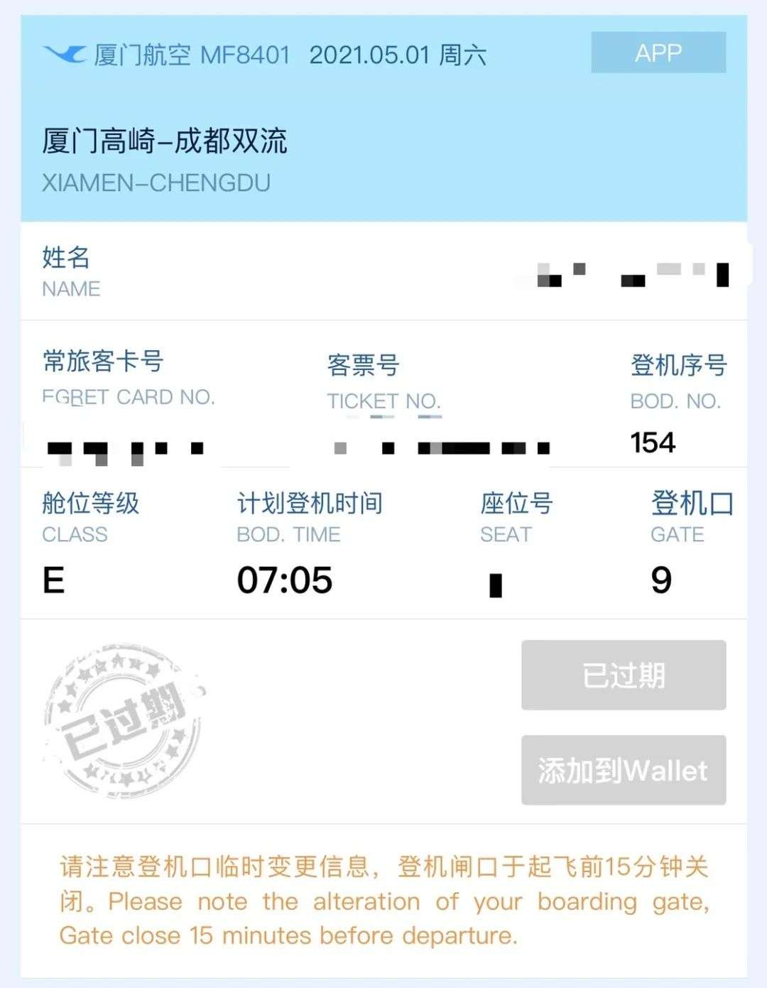 完成值机之后,有无纸化登机流程的航司会给旅客一张电子登机牌和二维码,这个二维码包含的信息可就丰富了,有你的行程信息、个人信息、登机序号等等等,可谓是大而全。所以,如果你要截图发在微博或者朋友圈请记得打码,这隐私泄露得可比你登机牌上明文可见的信息多多了。
