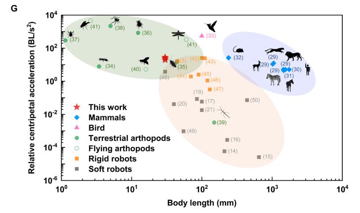 在 2019 年的一篇论文中,该研究团队就曾展示过一种类似小强的机器人,它可以以每秒 20 个身体长度 (约合每小时 1.5 英里) 的速度在平坦的表面上疾驰而过,相当于真的蟑螂可以达到的速度,也是目前像昆虫一样的仿生机器人中最快的速度。