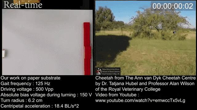 研究小组通过一根小电线实现供电和控制,展示机器人的大部分技能。论文称,对 “小强机器人” 的任何一个脚掌施加电压都会增加其和表面之间的静电,从而使机器人的脚掌更牢固地粘在表面上,并迫使机器人的其余部分绕这只脚旋转。这两个脚掌使研究人员可以完全控制机器人的轨迹,并允许机器人以超过大多数昆虫的向心加速度转弯。