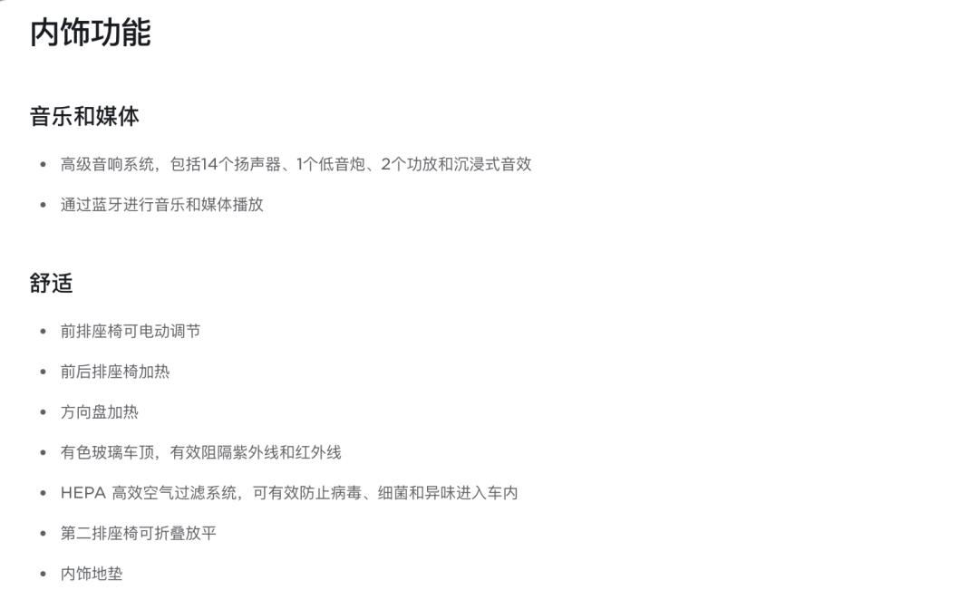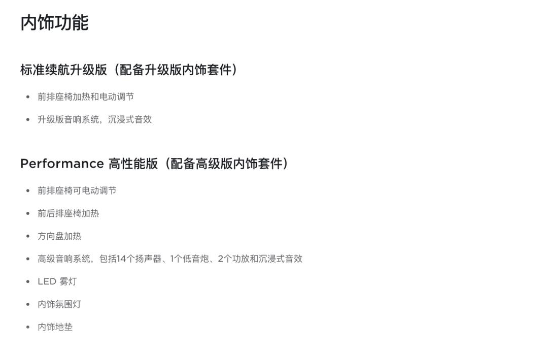 在仔细查阅官网以后我还发现这次的标准续航版 Model Y 的内饰配置也有「蹊跷」。以下是 Model 3 车型的内饰配置。