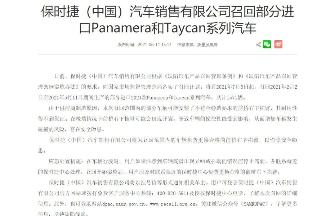 根据国家市场监督管理总局的公告显示,保时捷将那次召回的原因归结为供应商制造疏漏,安装了不符合锻造要求的前桥右下拖臂,其耐用性得不到保证。在极端情况下,该部件会出现开裂现象,从而会导致车辆发生碰撞的风险。
