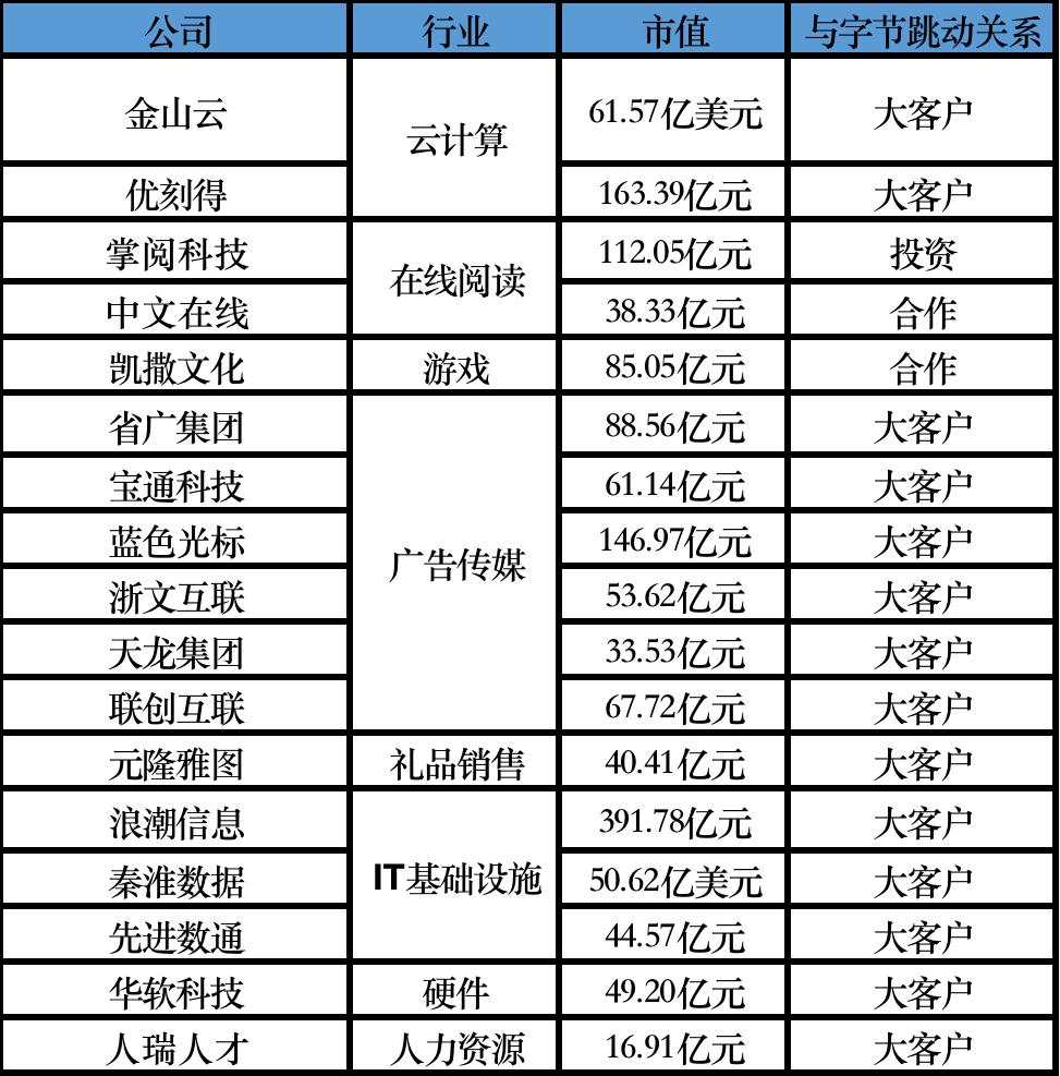 受益于字节跳动的快速发展,与之长期深度合作的上市公司们也受益于字节跳动带来的收入乃至股价上涨。
