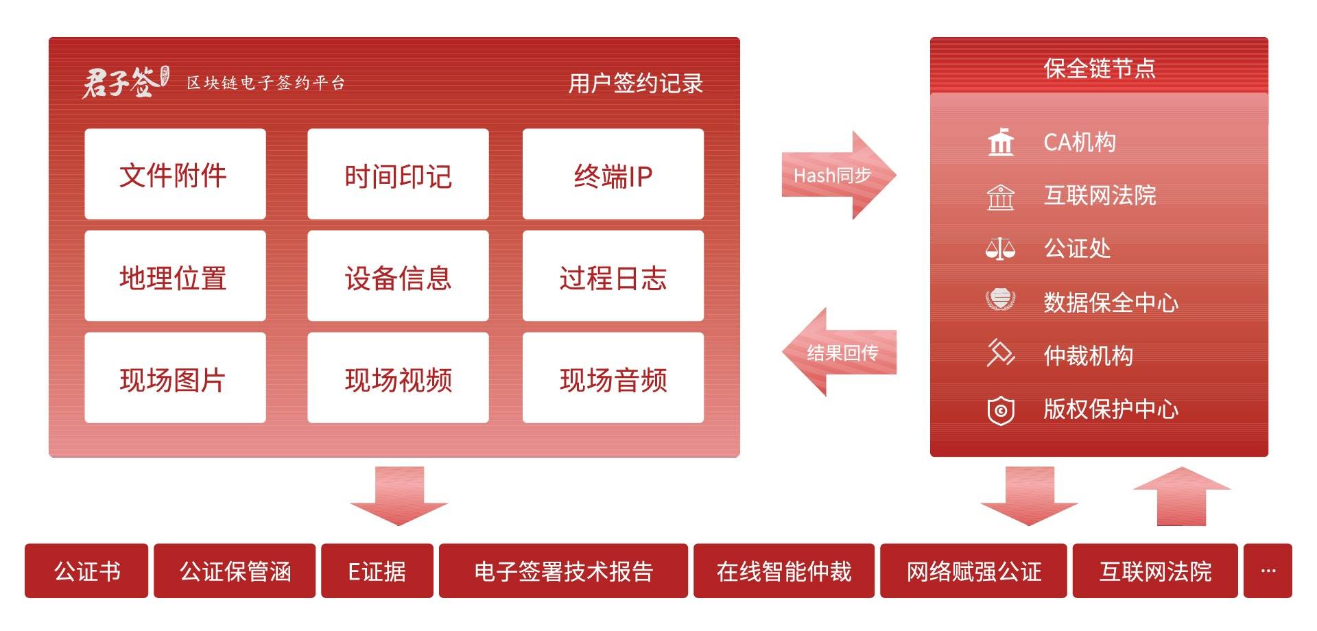 君子签区块链电子签章基于PKI/CA体系,采用数字认证、时间戳、区块链、全证据链等技术,首先,会对签章主体身份进行实名认证,保障身份信息真实有效;其次,会对加盖电子签章的公文、证照、协议、凭据等各类电子文件签署和操作数据进行区块链存证,从而形成记录全过程关键细节(签约终端、时间、地点、现场音视频、人脸识别视频存证等)的全证据链;最后,对签完后的每一份电子文件都会生成不可篡改的HASH加密文件,保证数据上链前的真实可靠和上链时的证据链完整、准确、不可篡改且真实有效。