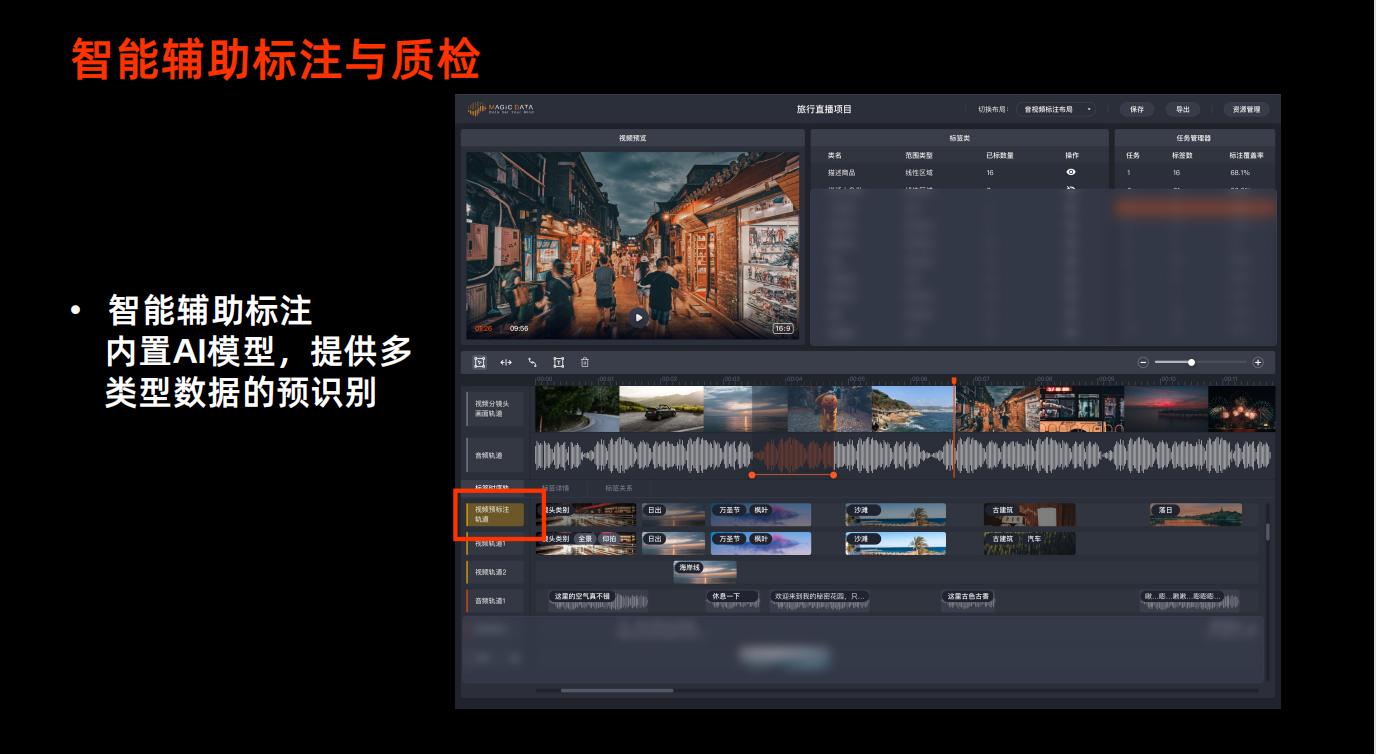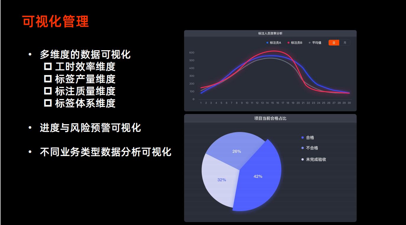 对于企业来说,数据标注要花费大量人力物力的一项作业,特别人员技能与任务不匹配时,时间和成本损耗较大,企业降本增效需求较为紧迫。北京爱数智慧Annotator ®5.0智能化标注平台支持标注任务分工协作和灵活的流程配置,复杂的任务可拆分成不同难易等级匹配给不同水平标注人。在可视化管理方面,平台体验进一步升级,可做到多维度数据、作业进度、风险预警等可视化。此外,平台还支持智能辅助标注、验收与质检,内置AI模型,提供多类型数据的预识别功能,帮助团队和个人标注效率快速提升,从而帮助企业降本增效。