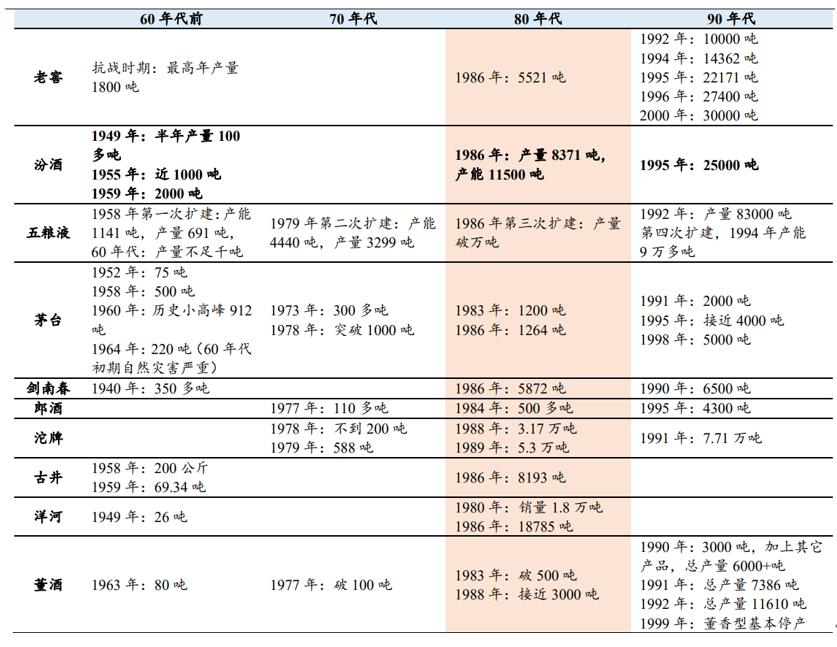 在快速扩量的比拼中,无论是泸州老窖、还是五粮液、茅台,都和汾酒无法相比。1985年,体制改革后的山西汾酒,产能成功翻番,达到1.15多万吨,全年产量突破8000吨,占据当时全国13种名酒产量的一半。相比之下,五粮液的总产能在1986年突破万吨,而茅台更是到2000年才达成这个成就。