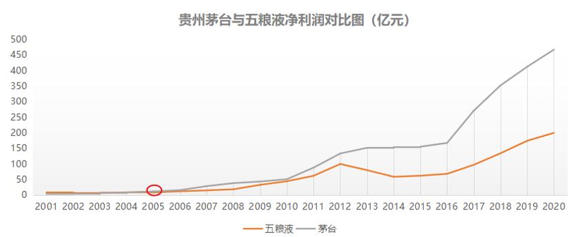 而茅台对五粮液的赶超首先体现在营收和净利润上。净利润是衡量企业盈利能力尤其是同一行业纵向对比的重要指标。2005年之前,五粮液净利润规模一直在茅台之上,但在2005年却被茅台超越,此后再也无法赶超;当年五粮液净利润7.91亿元,茅台净利润11.19亿。