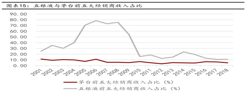 五粮液真正意识到大商制弊病是在08年前后,2005-2008年间五粮液前五大经销商营收占比超70%,而同期茅台占比一直在10%附近。直到2009年开始,大商制问题才开始有所有改观,到10年降至20%以下。