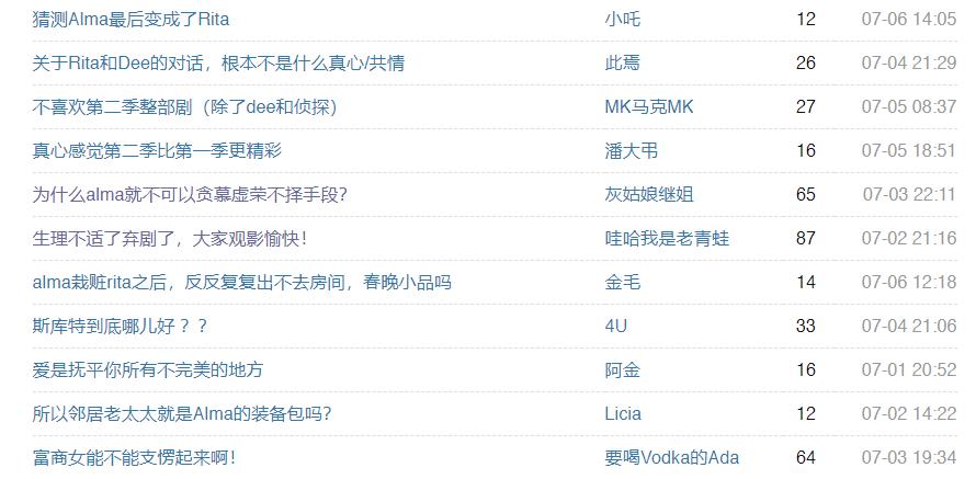 从豆瓣评分看,《顶楼》三季得分分别为6.7、7.6、7.0,总体来说波动不大。同样六月回归的《致命女人2》就没那么幸运,第二季目前评分为8.4,低于第一季整整1分,热度也表现也呈下滑趋势,不如第一季基本上周周有讨论。