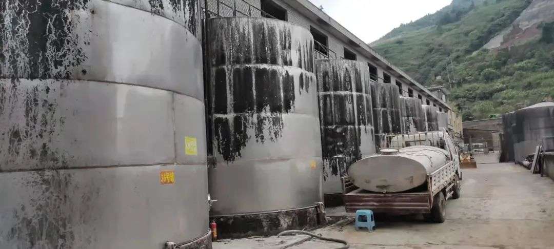 在生产车间的门口,规则地摆放着不锈钢储酒罐,但里面的储酒量,无从知晓。
