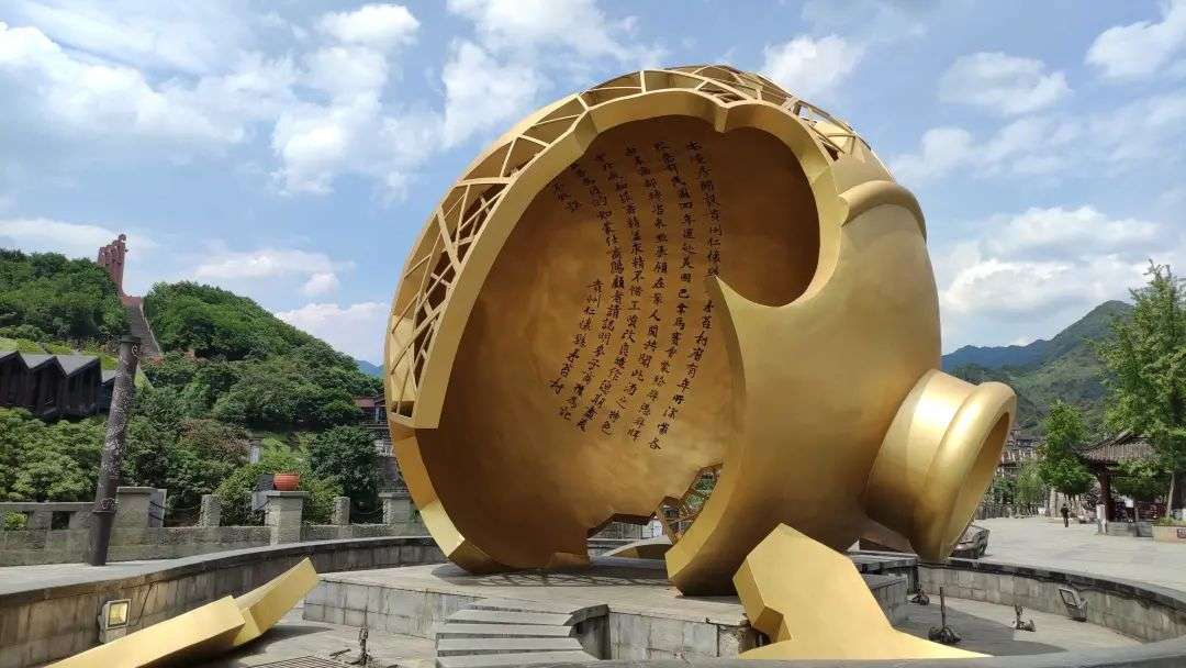 后来,茅台镇上就有了1915广场和破酒坛雕塑。1915广场建在赤水河畔,是茅台镇最繁华的地段。广场上,最耀眼的就是巨大的金色破酒坛雕塑。