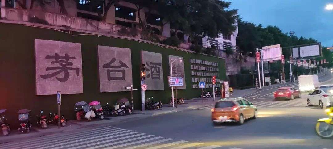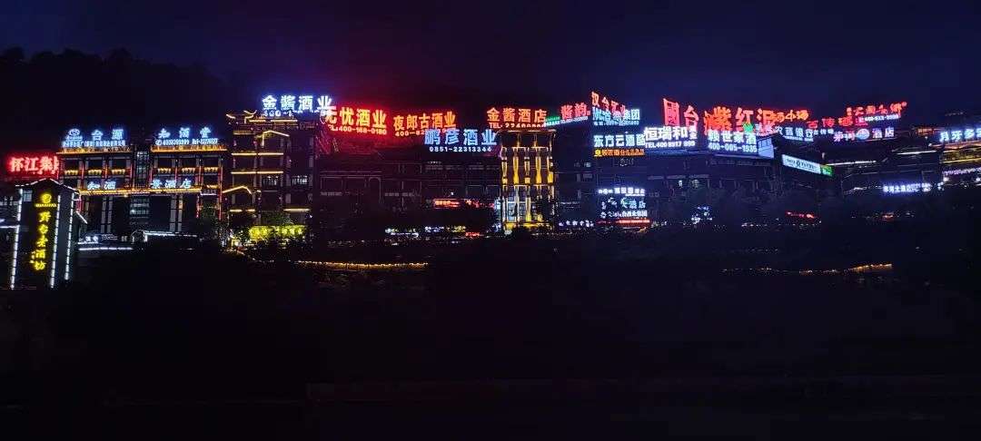 很多酒厂将招牌扎堆竖立在广场对岸,争夺广场上的眼球。尤其是到了晚上,招牌有了光与色的装饰,更是争芳斗艳一般。