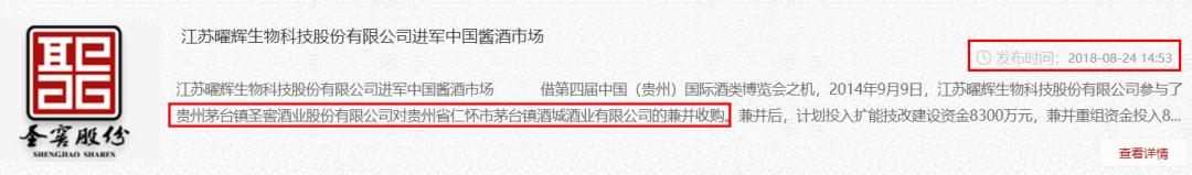 江苏曜辉生物科技股份有限公司的实控人也为刘见。意思很明显,酒城酒业在2014年被圣窖酒业兼并收购了。奇怪的是,这篇内容的发布时间是在四年后的2018年8月24日。