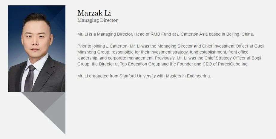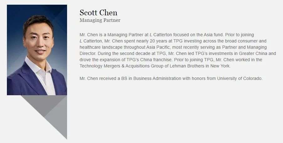 L Capital Asia在大中华区的第一任负责人是上文中提到的黄晗跻。根据官网和领英的资料,黄晗跻此前先后在Intel资本和香港对冲基金DE Shaw任职,2010年以创始成员的身份加入L Catterton Asia,此后一直是L Catterton Asia投委会的成员之一。