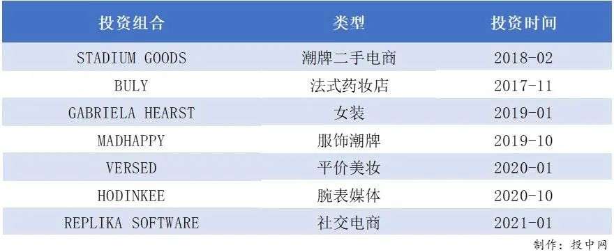 LVMH集团有自己的战略投资部门,包括2017年成立的新锐奢侈品牌投资部门LVMH Luxury Ventures,如上图所示,成立以来这个部门一共进行了7笔投资,投资对象多是一些早期的品牌和渠道。
