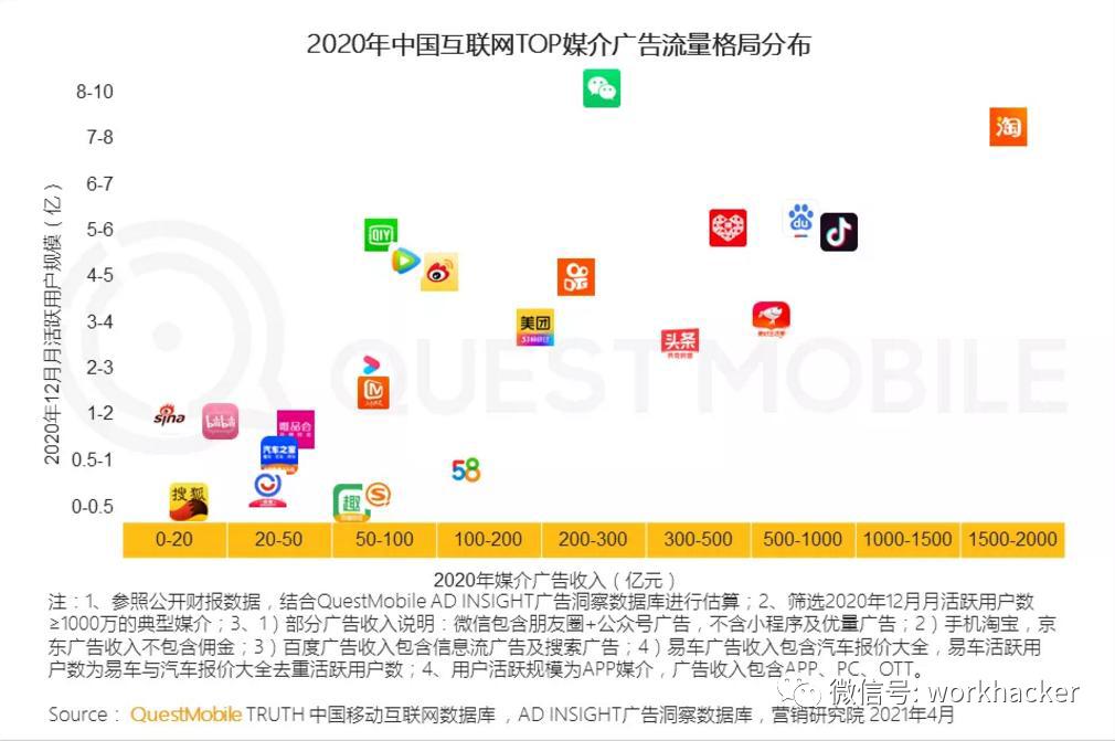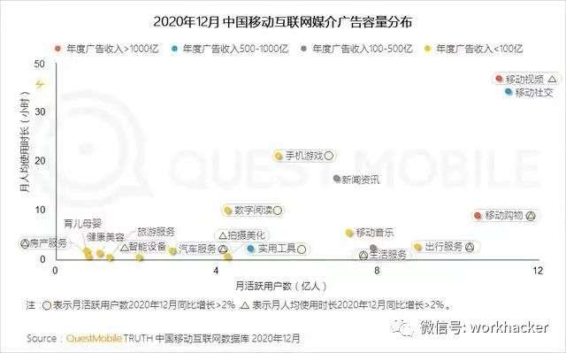 而根据QuestMobile的数据,截至2020年12月,整个中国的移动互联网媒介广告容量中,移动视频容量最大,年度广告收入超过1000亿;移动社交次之,年度广告收入在500-1000亿之间。