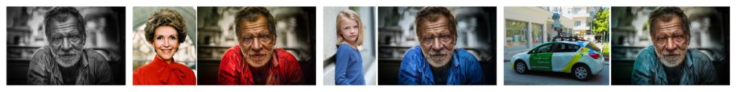 如上图所示,目标图像是最左边的黑白图像,如果给神经网络一个穿红衣服的女士的图像为参考,那么输出的结果里,人物的衣服颜色也是红色,肤色甚至也会更接近参考图像人物的肤色。