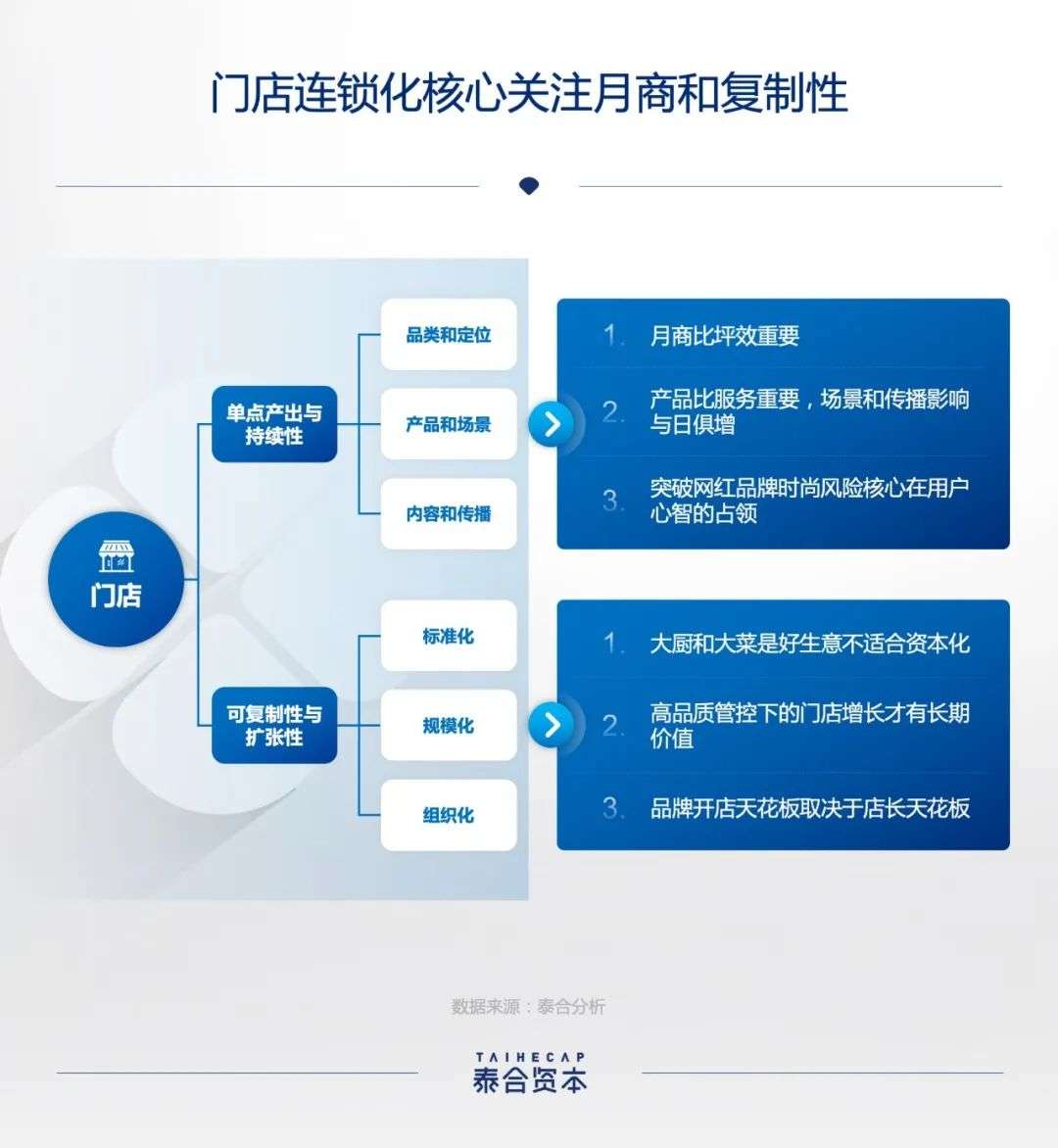 其中,我们今天重点展开门店连锁化这个方向。在门店端,一方面要看单点产出与持续性,即单个门店的产出效果;另一方面要看门店的可复制性与扩张性,即是否适合被复制、扩张的天花板在哪。