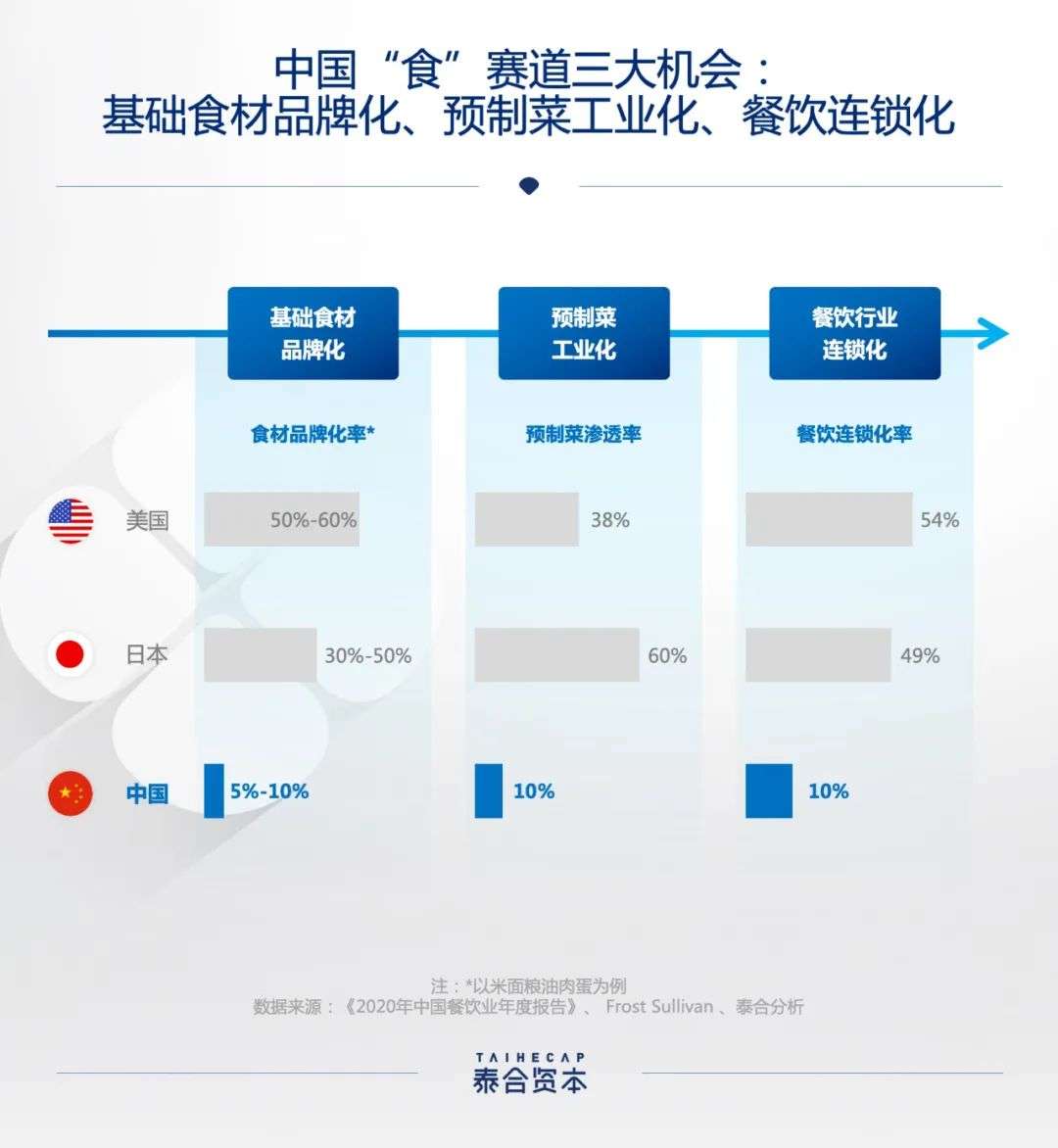 据泰合资本的观察,中国“食”赛道正酝酿着三个万亿级的机会,分别是基础食材品牌化、预制菜工业化与餐饮连锁化。