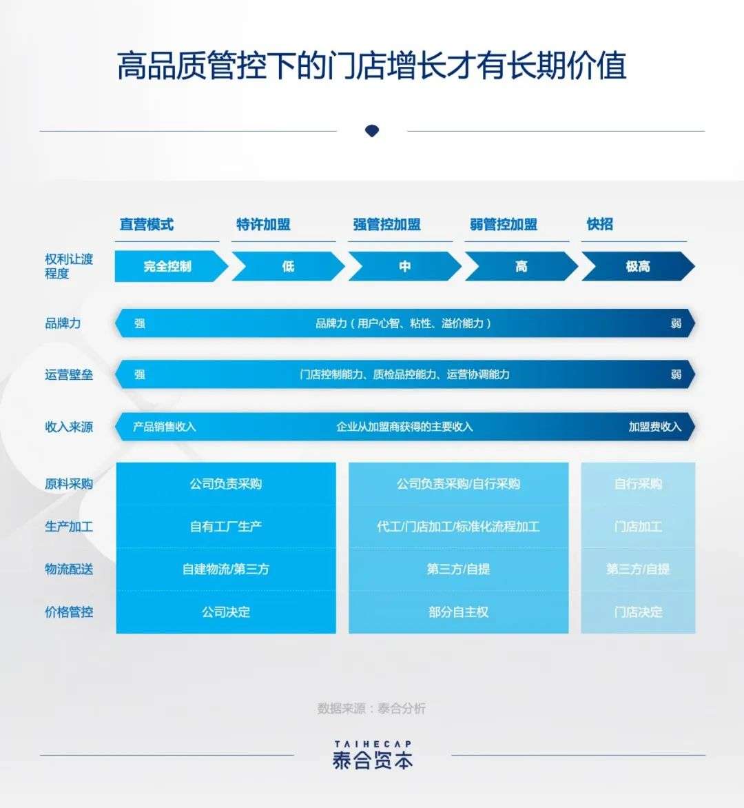 如果一些餐饮品牌前端的加盟商收入非常高,但公司层面上的收入与利润水平非常低,就说明它没有在整个产业链上创造足够多的价值——高品质管控下的门店才有长期价值,对快招模式的加盟保持警惕。