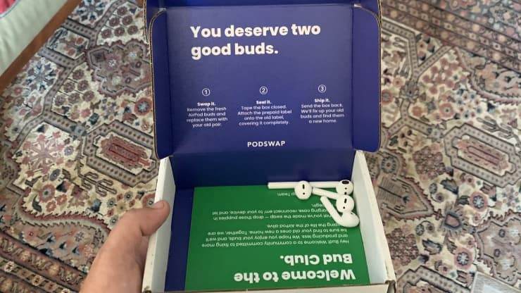 在PodSwp的Shopify网站上,只需花费59美元就可以获得更换了新电池的AirPods。除了这些新的耳机,PodSwp还提供盒子和返货标签,它想要回你的旧AirPods。然后,该公司对旧的AirPods进行清洁和消毒,更换新电池,并将它们发送给下一个想要更换旧AirPods电池的人。
