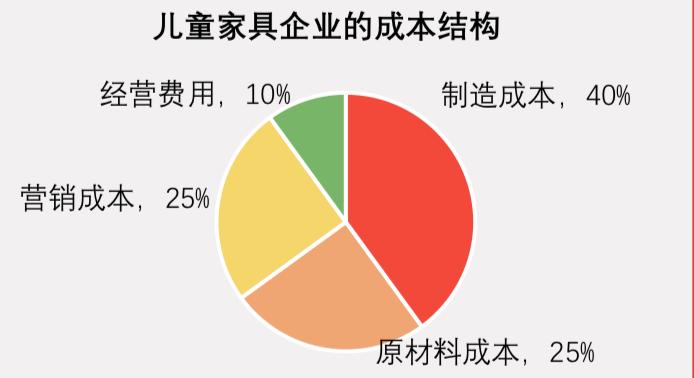 这一点,我们可以以儿童家具企业的成本结构看出端倪:在整个家具链条中,原材料和制造成本共占比达到65%,剩余35%来自营销成本以及经营费用。