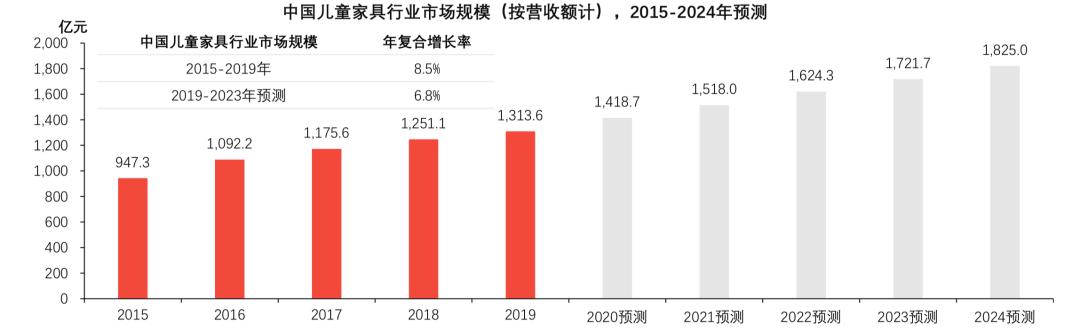 受此影响,根据统计,我国儿童家具行业发展迅速,其市场规模已经从2015年的947.3亿元增长至2019年的1313.6亿元,且年复合增长率达8.5%。按照6.8%的年复合增长率计算,预计2024年市场规模将达到1825.0亿元。