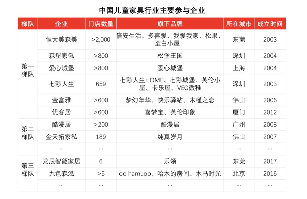 第三梯队:由小微型儿 童家具企业构成,企业的线下门店数量小于100家。第三梯队企业成立时间较晚,多以规模较小的设计类家具、定制类家具企业为主,代表企业包括龙辰智能家居、九色森 泓等,第三梯队企业市场占有率累计约为50%。