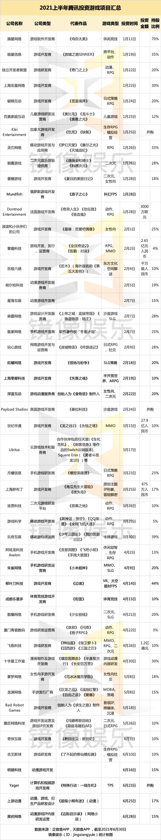 据多家媒体报道,腾讯于2021上半年集中投资了27家游戏公司,算下来平均7天就投资一家,并且覆盖了各大种类。