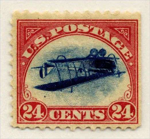 比如美国在1918年5月10日发行的一枚邮票,由于印刷错误,邮票中的柯蒂斯·珍妮-4飞机的图案上下颠倒:
