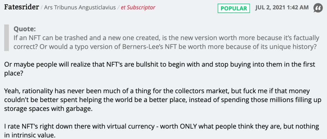 或许人们会意识到NFT就是在胡扯,并停止购买它?……我对NFT的评价和其他虚拟货币一样——只有人们赋予的价值,而没有内在价值。