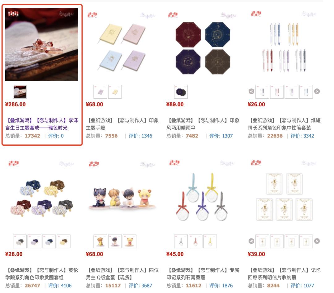 天猫的叠纸新意旗舰店中,不乏动辄总销量上万的《恋与制作人》周边,但其中最吸人眼球的无疑是单价286元的「李泽言生日主题套戒」,这件商品在不到十天里售出了1.7万份,仅套戒单品就为叠纸带来了500万元的销售额。
