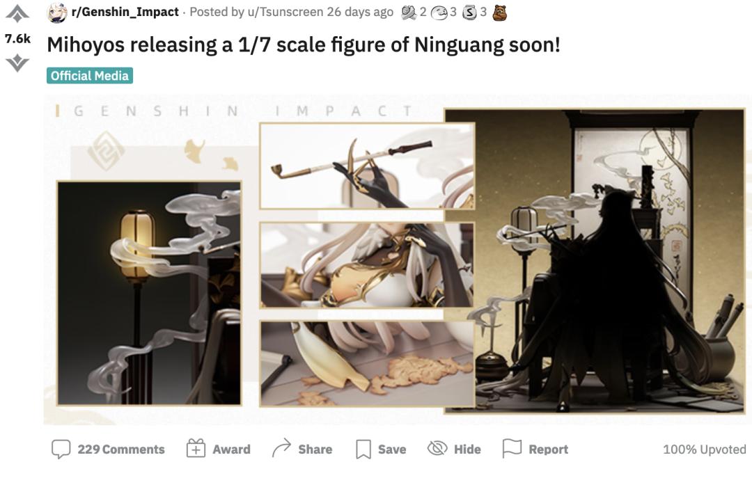 凝光在《原神》中虽然只是一位四星角色,但其颜值和气质却是目前提瓦特大陆上数一数二的,雍容华贵的旗袍设计更是让海外玩家拍案叫绝。在Reddit上,手办的消息一经传开就引起了一众外服网友的关注,对这款手办抱有很高的期待。