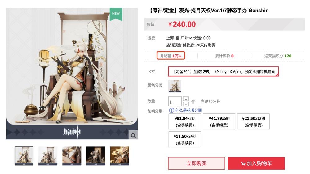 6月16日开启预定的《原神》「凝光·掩月天权」手办(以下简称凝光手办)全款1299元,正儿八经的手办售价肯定会劝退大部分玩家吧?事实却并非如此,目前凝光手办仅7月份预约量达到了惊人的1.1万件,估算销售额超1500万元。