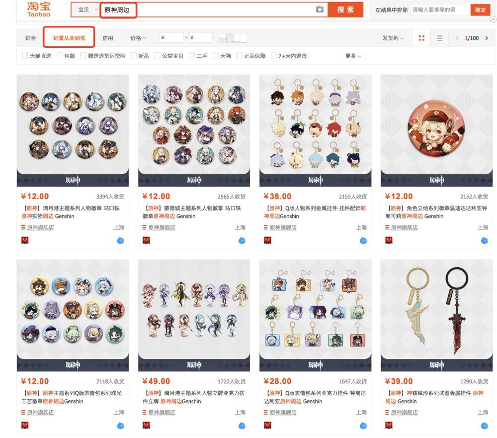 在二次元游戏周边的爆发式畅销中,官方周边占据着统治性的地位,以淘宝词条搜索「原神周边」为例,销量(用户收货量)前排都被米哈游自家的官方旗舰店商品“霸占”。