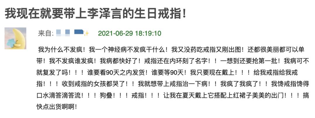 可惜等待总是令人望眼欲穿,自1月李泽言生日套戒筹备设计以来,恋与玩家光是等待实物图就已经过去了五个多月的时间,更别说预约全款还得再等上90天(晚了就是150天),粗略算下来大概可以等一年,玩家骂归骂,这些愿意给钱还能等下去的都是真爱了。