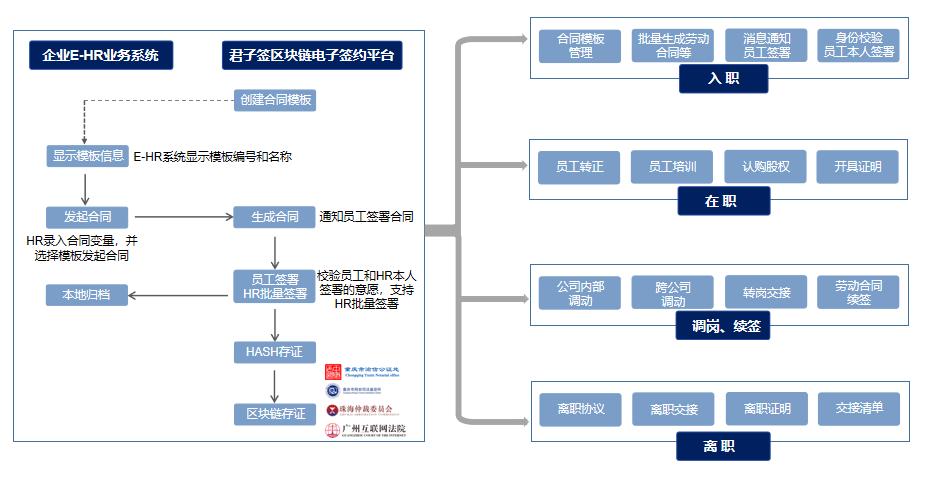 君子签针对集团型企业纸质合同签署难题,通过与企业OA办公、人事管理系统无缝集成,提供“实名认证、在线签署、合同管理、区块链存证保全、司法服务”等一站式区块链电子签约服务,覆盖员工“入、转、调、离”全生命周期。