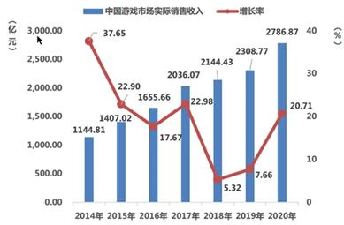 游戏行业整体是在不断发展的,2020年,中国游戏市场销售收入达2786.87亿元,同比增长20.7%;其中移动游戏市场规模2096.8亿元,同比增速32.6%。