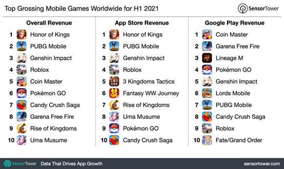 另一方面,2021年上半年,全球移动游戏收入排名第一的依然是王者荣耀,达到了15亿美元。《PUBG Mobile》和《原神》紧随其后,《万国觉醒》也冲进前十。
