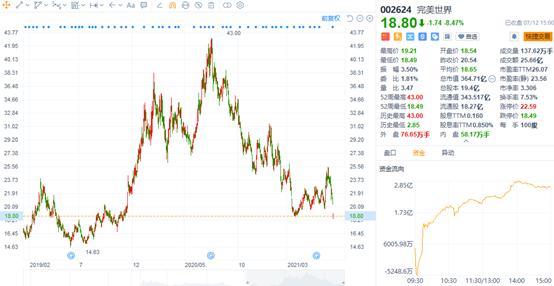 今日,完美世界股价一度跌停,截至收盘跌幅收窄至8.5%,报18.8元,以7.5%的换手率成交高达25.66亿元,最新总市值364.7亿元。