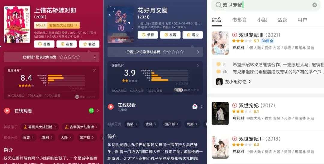 前者比如《花好月又圆》,这部剧翻拍自曾经红极一时的《上错花轿嫁对郎》,开播前还有些网友期待,开播后浓浓的古偶风就把网友劝退了,豆瓣评分不到4,评价人数2000多,真的有点“毁经典”。
