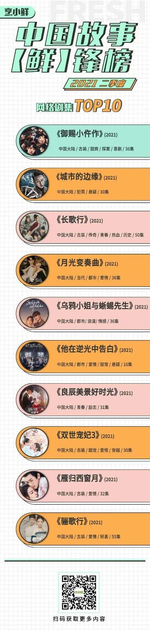 说明:以2021年3月15日至2021年6月15日中国大陆上新剧集为统计基础,择取豆瓣打分人数超过2W且评分在5分以上的作品,综合口碑和热度加权,测算出2021年的「故事鲜指数」,得出Q2榜单。