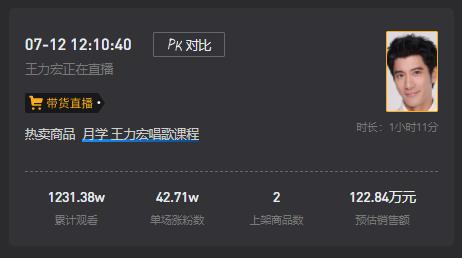 当然,王力宏的胡子也没白刮,据王力宏在直播中公布的数据,在这场时长71分钟的直播中,客单价1699元的课程卖了3450份,直播GMV586.16万元。