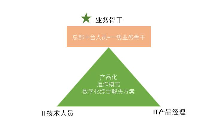 这么做的好处是,IT能够不断下沉,深入业务前线,同时把中台技术和业务部门骨干提前卷入,从而形成了「IT产品经理+业务骨干+IT技术人员」的铁三角运作模式,最大程度地杜绝了过程中需求不清晰、部门间拉扯等情况,保证项目的高效进行。