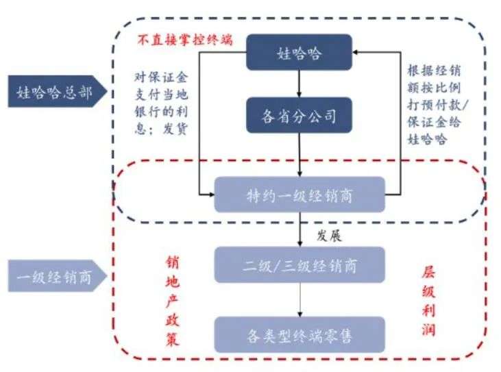 娃哈哈采用渠道联销体的销售模式,充分利用渠道杠杆,将商品呈现在超市和小卖部中。通过经销商打保证金,娃哈哈给予每月返息的方式,在全国范围内聚集了实力强大的经销商。在广告宣传上,与电视台广告部签订批量广告合同降低宣传成本。娃哈哈凭借着生产、运输、渠道、营销及人力等方面的成本优势,实现了3天内快速铺货于300万+终端网点。