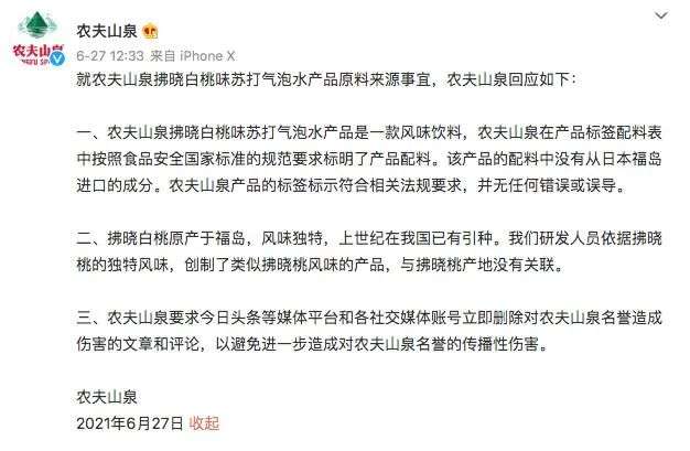 对于“日本福岛县产”的宣传,农夫山泉官方回应称,拂晓白桃原产于福岛,在我国已有引种。其团队研发人员依据拂晓桃的独特风味,创制了类似拂晓桃风味的产品,与拂晓桃产地没有关联。