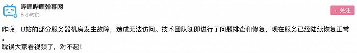 “B站崩了”冲上热搜,回应称部分服务器机房发生故障