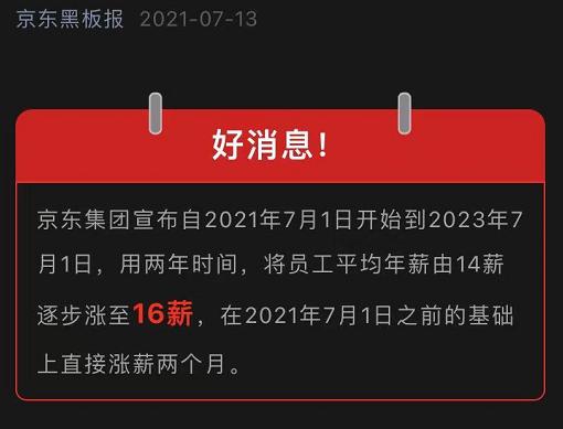 京东集团宣布,自2021年7月1日开始到2023年7月1日,用两年时间,将员工平均年薪由14薪逐步涨至16薪,在2021年7月1日之前的基础上直接涨薪两个月。