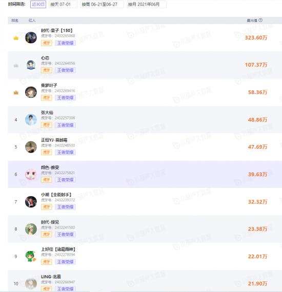 类似的情况同样出现在虎牙王者荣耀版块,王者荣耀“一哥”张大仙在6月的榜单中排名第4位,流水收入仅仅只有48.86万。要知道2020年的大仙日均流水还在百万上下,更是创造过当日直播1252.99万流水的历史最佳,这已经不只是断崖式,属于已经跌掉了一个位面了。