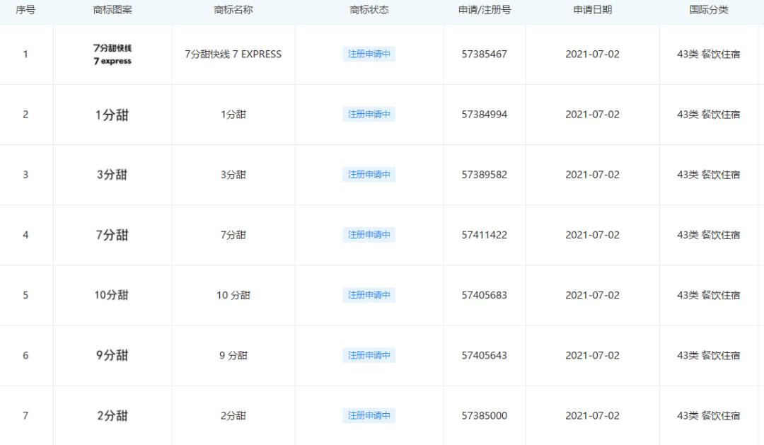 今天,内参君在企查查看到,茶饮品牌7分甜正在申请注册“1分甜”、“2分甜”......“10分甜”商标,国际分类均为餐饮住宿,申请日期在7月2日。